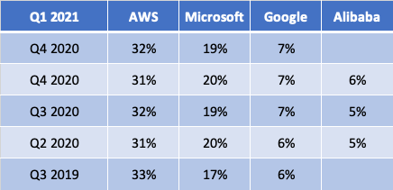 Selon la dernière note publiée par le cabinet d’analyse CANALYS, le marché mondial des services cloud approche de la barre des 42 milliards de dollars au 1er trimestre 2021, ce qui représente une croissance annuelle de 35%. Sans surprise, on retrouve en tête le trio AWS/Microsoft/Google, dans le même ordre et avec des estimations Canalys de parts de marché qui varient peu :