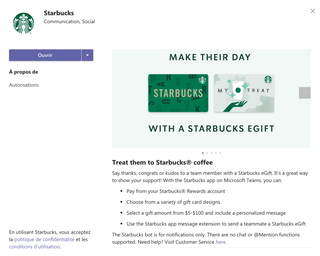Téléchargez pour cela l’application Starbucks pour Teams, puis connectez vous à votre compte et envoyez des cartes cadeau Starbucks à vos (meilleurs !) amis.
