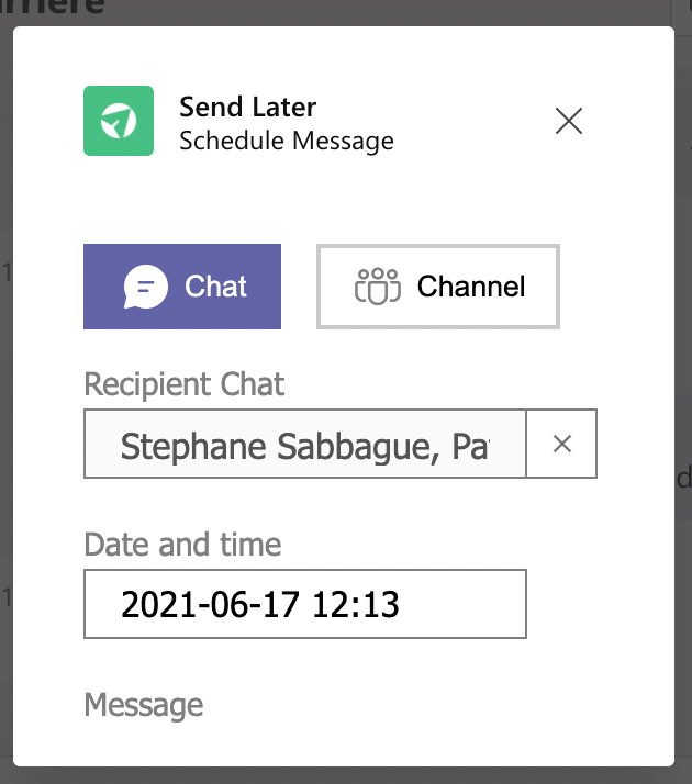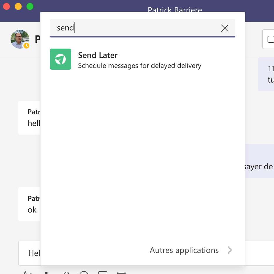 Pour rappel, pour pouvoir envoyer sous Teams des messages en différé, il suffit d’utiliser l’application intégrée « Send Later ». Lorsque vous composez un message, cliquez sur les 3 points en dessous et choisissez l’application « Send Later ».Ajoutez l’application et vous pouvez maintenant envoyer votre message à une date / horaire de votre choix avec l’interface présente ici :