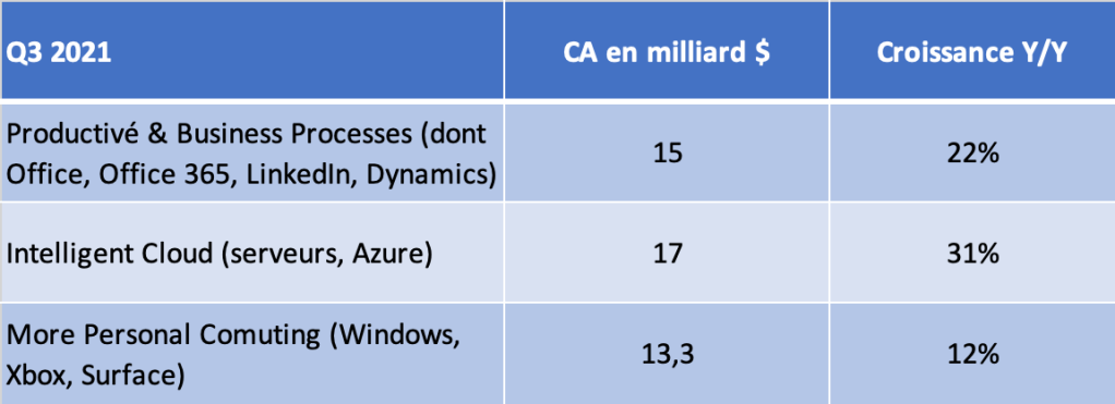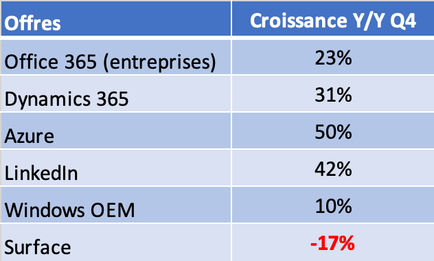 Encore un beau trimestre pour Microsoft, avec plus de 45 milliards de $ de CA (+22%) et un résultat net à plus de 20 milliards. A noter que Microsoft se place devant tous ses concurrents en termes de ratio CA/net (45%), loin devant Facebook et Google (respectivement à 31,7% et 26,7%).