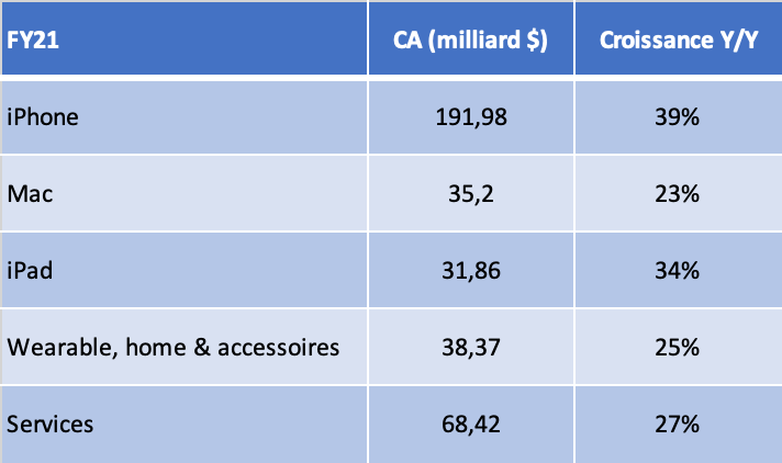 Les iPhones pèsent toujours aussi lourd dans la balance des résultats (52% du CA 2021), et continuent leur croissance (+39% d’une année sur l’autre !).
