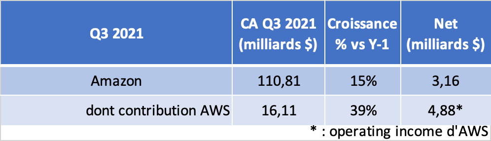 AWS continue de jouer son rôle de contributeur essentiel au résultat net du groupe, avec un résultat d’exploitation (operating income) pour AWS de près de 4,9 milliards de dollars, quand le net du groupe est de 3,16. Si Microsoft revendique 20 milliards de dollars pour son activité cloud, AWS, sans Office 365, continue à progresser à 39% sur ce trimestre et ses plus de 16 milliards de CA témoigne de sa réussite toujours aussi manifeste.