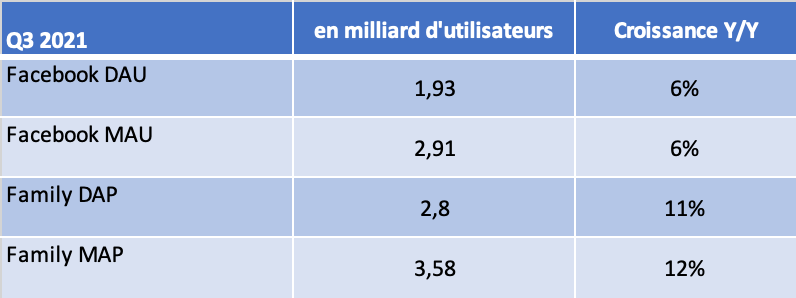 DAU : Daily Active Users, MAU : Monthly Active Users, la Famille Facebook : Facebook, WhatsApp, Instagram, Oculus.