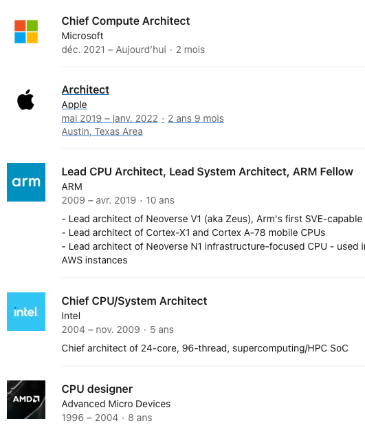 Mike Filippo était chez Apple depuis 3 ans mais il a fait une bonne partie de sa carrière chez ARM après être entré chez Intel et AMD, donc un vrai spécialiste. Et une embauche très interessante à l’époque pour Apple dans le cadre de son programme de puces maison visant à s’affranchir d’Intel… Une ambition qui semble être commune avec Microsoft.