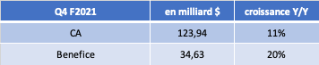 L’entreprise publie également ses résultats pour l’année complète 2021, avec un CA qui atteint le niveau exceptionnel de 470 milliards de dollars (à titre de comparaison, ceci représente le double du PIB du Portugal ou 1/4 de celui de l’Italie !!).