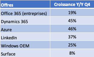 - Microsoft Cloud : 22,1 milliards de dollars (+32%), soit un run rate annuel de 88 milliards de dollars. Si cette catégorie ne correspond pas à un segment business, on y trouve Azure, Microsoft 365, Dynamics 365, LinkedIn).