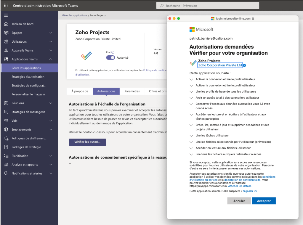 Pour activer cette possibilité, l’administrateur Teams doit d’abord autoriser la mise à disposition de l’appli en question, qui supporte ce mode (ici Zoho dans les copies d’écran), via le centre d’administration de Teams.