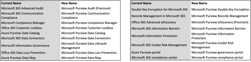 Ce rebranding vise à aligner l’ensemble de l’offre Microsoft concernant les services de compliance et de gouvernance des données autour de la marque Purview. Initialement lancée sous la gamme Azure Purview à l’automne 2021, l’ensemble des services sont maintenant brandés Microsoft Purview (on a déjà connu ce glissement :)). Viennent s’y ajouter une certains nombres de services Microsoft 365 taggés « Compliance ». La liste des modifications des changements de noms est ainsi fournie par Microsoft :