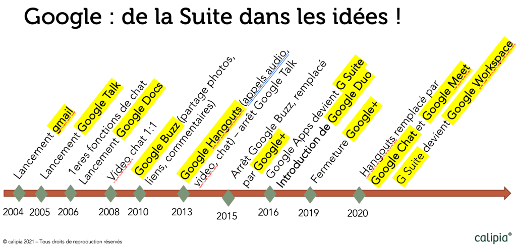Depuis de nombreuses années, Google se débat pour disposer (et communiquer sur) une offre de solutions de communication homogène, simple et compétitive. Le résultat visible de cette volonté est une offre pléthorique, avec beaucoup de recouvrement, et des solutions qui arrivent, qui disparaissent, fusionnent… sans beaucoup de clarté !