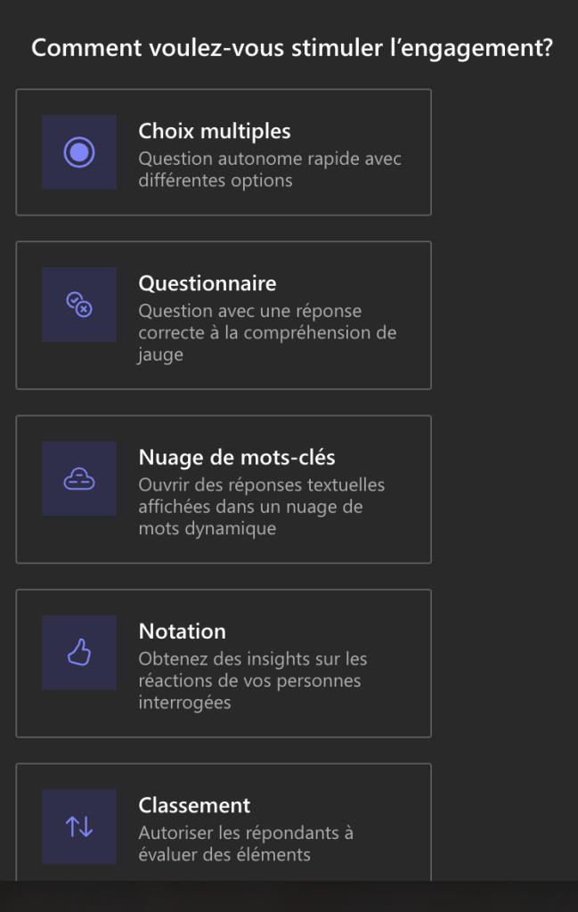 Alors oui, l’utilisation de sondages (via Form) était déjà disponible dans la pratique, mais nous avons ici à faire à une option super rapide à utiliser afin d’en faciliter l’usage. Ainsi vous pouvez lancer l’un des trois types de sondage prédéfinis en un seul clic, ce qui ne vous prendra pas beaucoup de temps. On retrouve ainsi les types de sondage prédéfinis suivants :