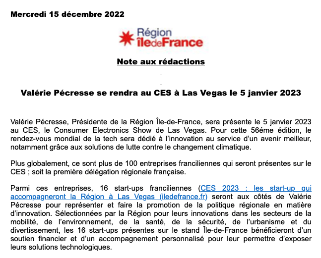 Amusant de voir aussi les différences de communications : Alors que le service de presse de La région Sud distribue un dossier de presse très complet et très bien fait mettant en avant les entreprises de la région qui seront présentes et leurs solutions, tout comme la région Auvergne Rhône-alpes et la région Haut de France par exemple , le service de presse de la région Ile de France annonce triomphalement que « Valérie Pécresse se rendra au CES à Las Vegas le 5 janvier 2023« … Réellement un « faire-venir » pour l’investisseur international ?