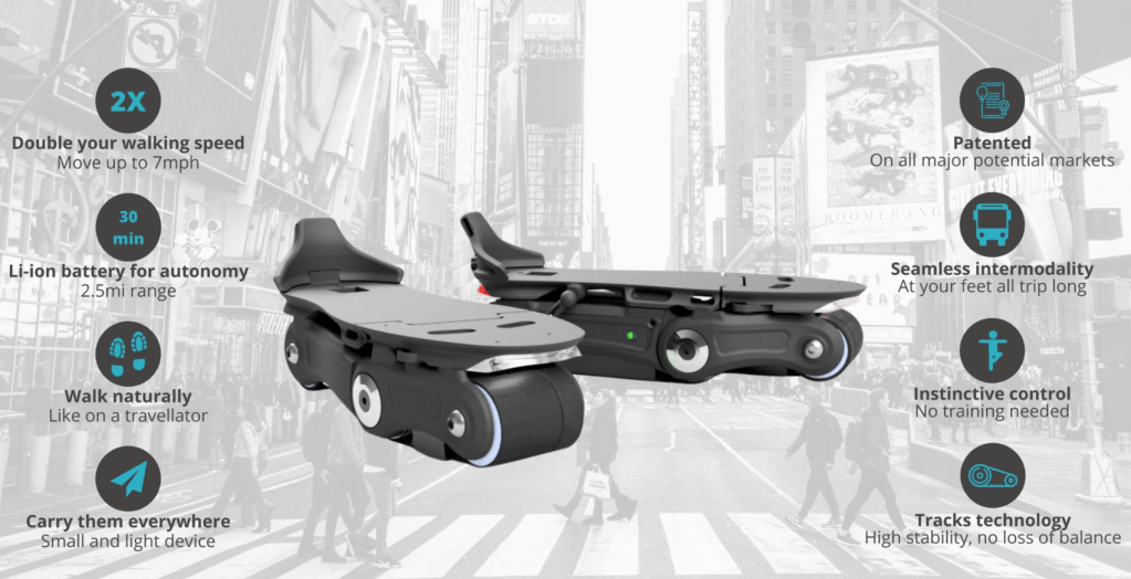 Solution très interessante d’une startup française pour les citadins : augmenter votre vitesse de déplacement en accélérant votre marche. Ce ne sont pas des patins électriques. C’est un peu comme des vélos à assistance électrique : si vous pédaler ils vous aident, ici, si vous marchez ils vous accélèrent ! Pas bête du tout.