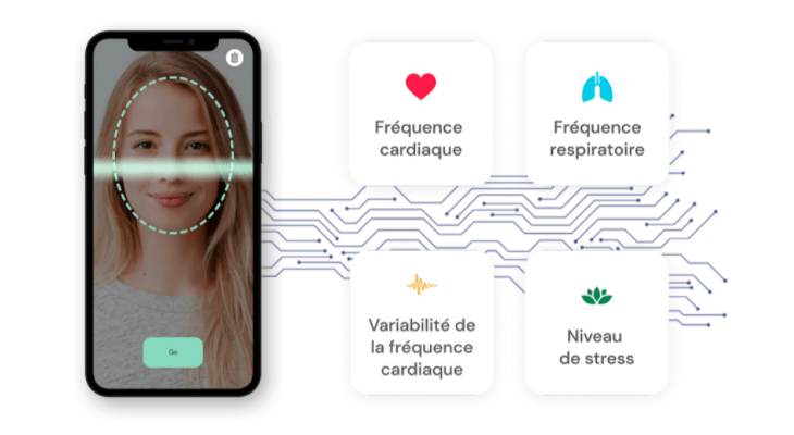 Le flux vidéo est analysé grâce à la technologie rPPG, des algorithmes avancés d’IA et de deep learning, ia le traitement de l’image du visage et le traitement du signal (en particulier pour mesurer la tension artérielle) et quelques secondes plus tard nous obtenons (ou le médecin à distance) la Fréquence Cardiaque, Fréquence Respiratoire, Niveau de Stress, et la tension artérielle (à condition d’avoir dans ce dernier cas une mesure de référence effectuée avec un appareil classique).