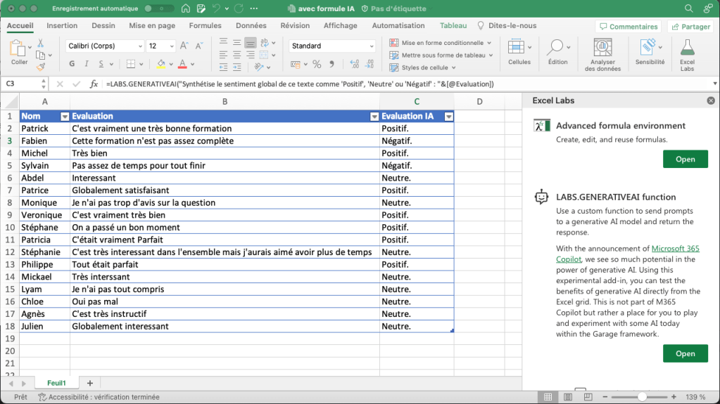 =LABS.GENERATIVEAI(« Synthétise le sentiment global de ce texte comme ‘Positif’, ‘Neutre’ ou ‘Négatif’ : « &[@Evaluation])
