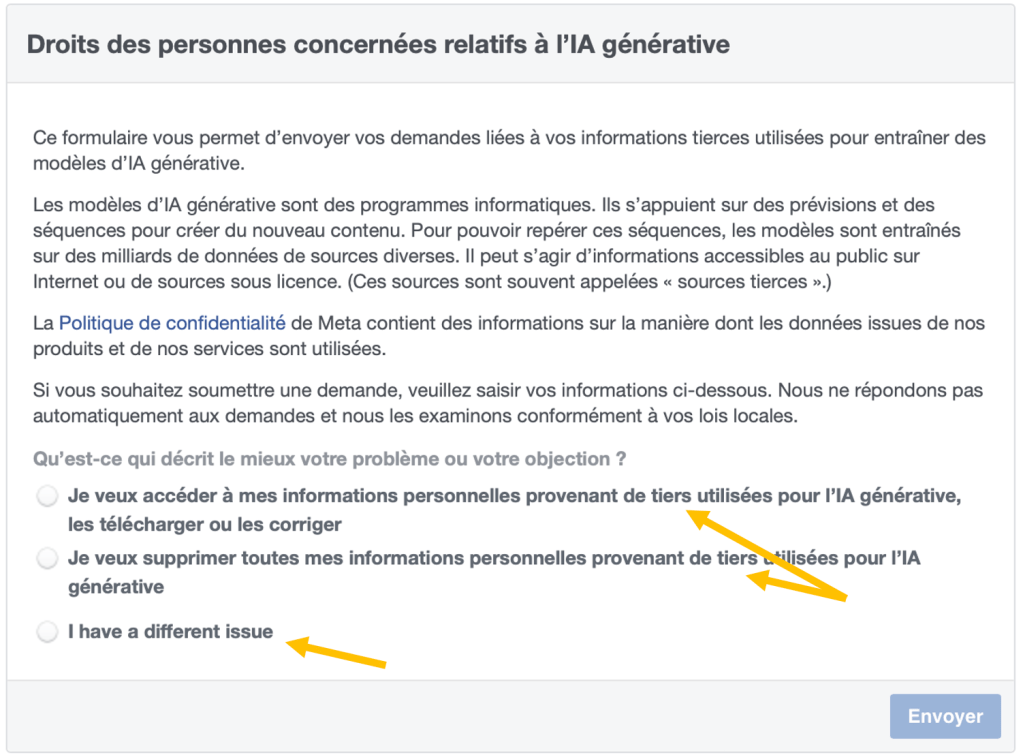 - Rendez-vous sur le formulaire de droits des personnes concernées par l’IA générative de Facebook.