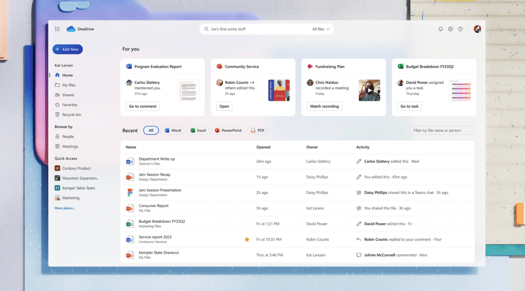 « La nouvelle expérience OneDrive Home réduit le temps nécessaire pour trouver vos fichiers afin que vous puissiez consacrer plus de temps à vos activités. Notre nouvelle zone « Pour vous » utilise des recommandations de fichiers alimentées par l’IA pour faire apparaître des fichiers personnalisés, en plaçant le contenu le plus pertinent et le plus urgent en haut de votre OneDrive. Nous avons également ajouté une organisation riche, basée sur le contexte, telle que des vues qui vous montrent les fichiers récents, partagés et favoris, ainsi que les fichiers des réunions.«