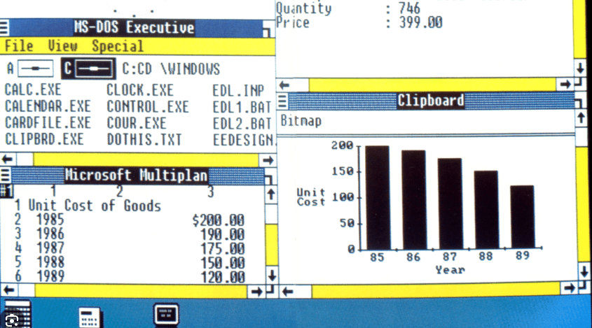 Bill Gates, cofondateur de Microsoft, aurait commencé à s’intéresser à la création d’un système d’exploitation basé sur une interface graphique pour PC après avoir vu une démo d’un autre système d’exploitation de conception similaire. Visi On, en 1983. Au début de l’année 1983, Apple a lancé son ordinateur Lisa avec sa propre interface graphique, bien qu’à près de 10 000 $ (plus de 22 000 $ en dollars d’aujourd’hui), son prix l’ait tenu hors de portée de la plupart des gens. Microsoft voulait créer un système d’exploitation à interface graphique beaucoup plus abordable que les logiciels concurrents et visait un prix compris entre 100 et 250 dollars pour le système d’exploitation. Gros plus également, Windows pouvait également exécuter n’importe quel programme MS-DOS (lui meme sorti 2 ans plus tôt et équipant les IBM PC) . Windows n’était pas autonome était bel et bien un sur ensemble de MS DOS avec ses contraintes, en particulier un manque de fonctionnement multi-taches… une autre époque.
