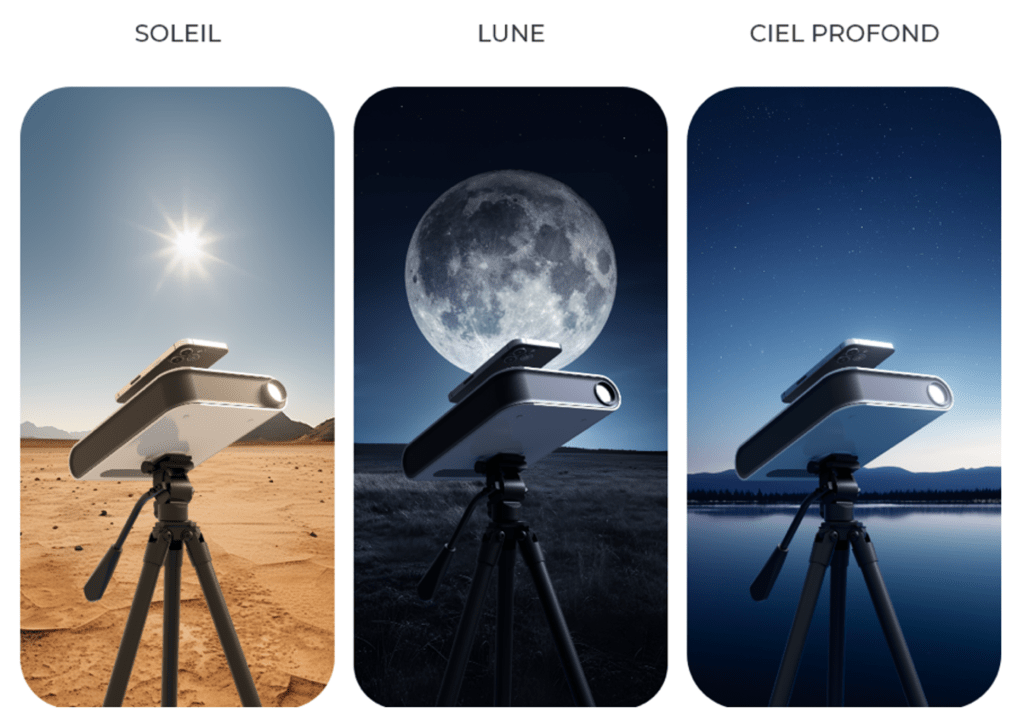 L’objet est largement transportable et pour l’utiliser Il suffit de placer son smartphone dessus et de suivre les lumières pour aligner correctement le télescope.