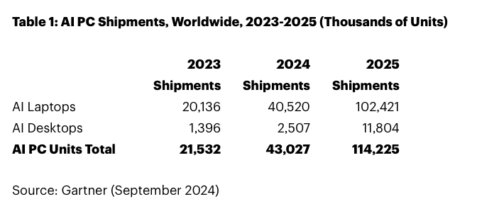 L’un des points saillants du rapport de Gartner est la prévision des ventes mondiales d’ordinateurs IA. En 2025, ces appareils devraient représenter 43 % de l’ensemble des expéditions mondiales de PC. Le marché des ordinateurs IA, défini par Gartner comme ceux disposant d’une unité de traitement neuronal (NPU) intégrée, est en plein essor. L’année prochaine, 114 millions d’unités devraient être expédiées, ce qui représente une augmentation de 165,5 % par rapport à 2024. Pour 2023, Gartner estime que 43 millions d’ordinateurs IA seront livrés, soit une hausse impressionnante de 99,8 % par rapport à 2022. Sans surprise, la demande d’ordinateurs portables IA dépasse largement celle des ordinateurs de bureau. En 2024, Gartner prévoit la livraison de 40,5 millions de portables IA, contre seulement 2,5 millions de PC de bureau IA. Toutefois, cette tendance devrait légèrement s’équilibrer en 2025, avec une augmentation des expéditions de PC de bureau IA à 11,8 millions, tandis que les ordinateurs portables IA atteindront 102,4 millions d’unités.