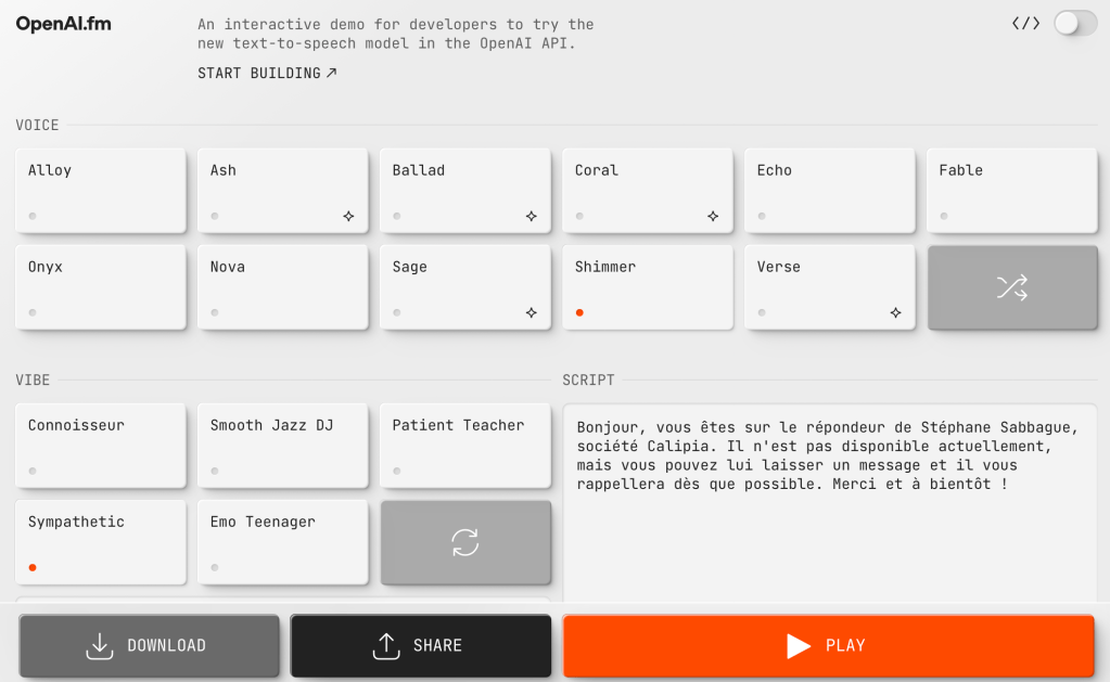 Vous pouvez tester ceci directement (et gratuitement) sur https://www.openai.fm.