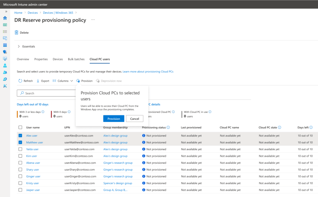 Ici, pas de VM dormant inutilement. Le Cloud PC Reserve est provisionné uniquement à la demande, via Microsoft Intune. Les administrateurs définissent une politique de déploiement simplifiée par rapport aux éditions Windows 365 Enterprise ou Frontline, incluant :