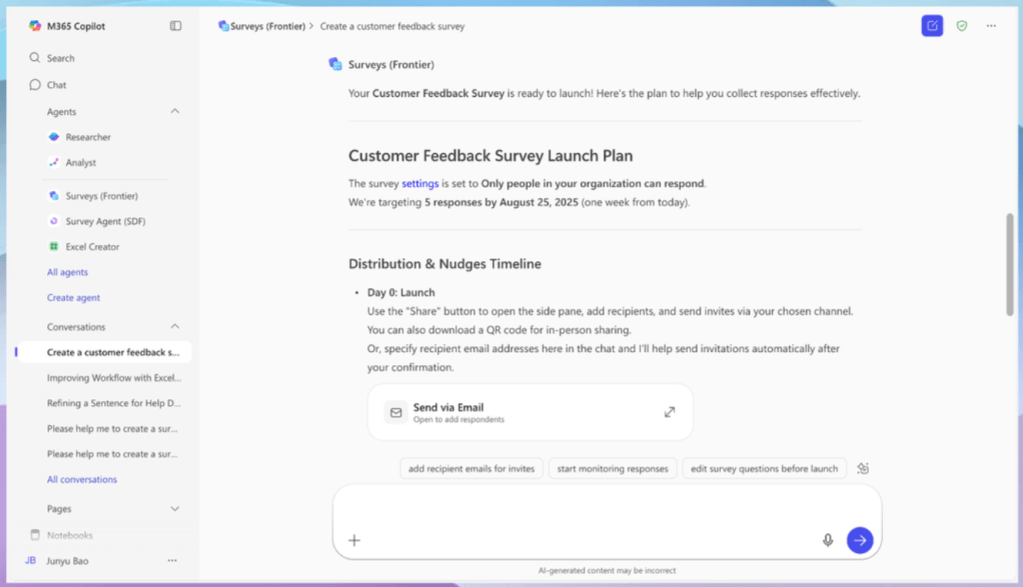 Le fonctionnement est calqué sur les autres agents Copilot. Depuis le panneau latéral, l’utilisateur saisit un simple prompt du type « feedback formation sécurité » et l’agent génère un formulaire clé en main. Quelques exemples préintégrés permettent d’aller encore plus vite. L’étape suivante consiste à valider l’aperçu puis à indiquer « Ready to send ». L’IA élabore alors un plan de distribution sur mesure : quel canal utiliser (Teams, Outlook, lien direct), à quel moment lancer les invitations et quand relancer les retardataires. Autrement dit, elle joue à la fois le rôle de marketeur, de planificateur et de secrétaire de direction.
