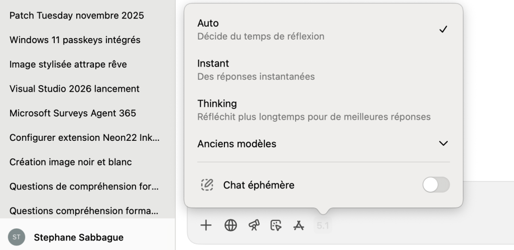 - GPT-5.1 Instant, le modèle par défaut, utilisé massivement dans les interactions classiques avec ChatGPT.