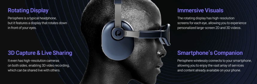 Perisphere est le premier casque-écouteur intelligent intégrant simultanément audio haute-fidélité, un écran Full HD rétractable, deux caméras stéréoscopiques (4 caméras au total), et microphones stéréo. Créé par Geeks Loft (startup coréenne), c’est un hub médias portable privé transformant les écouteurs en appareil de création 3D, de visionnage et de partage instantané — tout sans les mains, modes écran déployé ou rétracté. Poids optimisé: 14,82 oz (environ 420g) avec distribution équilibrée sur le bandeau. La solution vient d’obtenir un Best of Innovation Award.